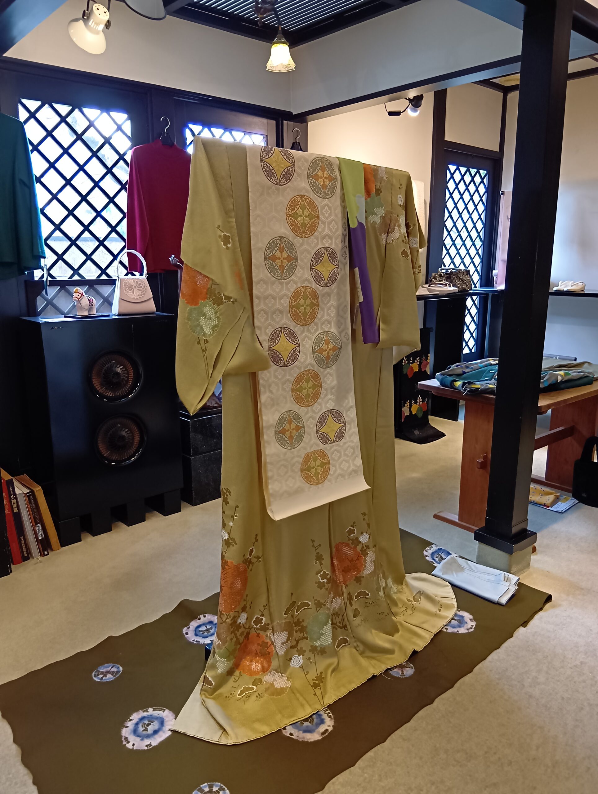有職織ー喜多川俵二ー 投稿日: 2026年1月23日 2:29 PM miccho コメント サロンにて。 桶絞りの訪問着をディスプレイ中です(藤井絞) ゴールドがかったグリーンの地色は、永くお召しいただけます。 柄行も上品で幅広いフォーマルシーンに活躍します。 有職織の帯と共に(喜多川俵仁作)色合いの整った装いとなりました。 260119123810652 📂投稿グループ お着物の話題 商品のご紹介